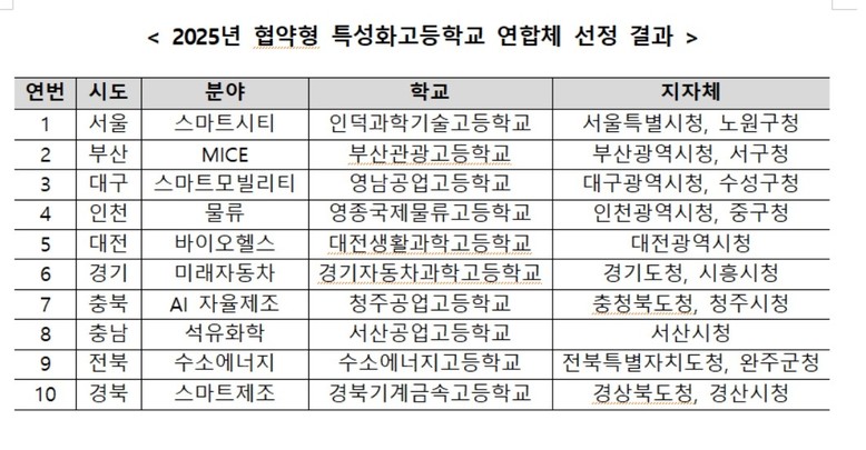 ◦2025년 교육부 지정 전국 10대 협약형 특성화고 최종 선정