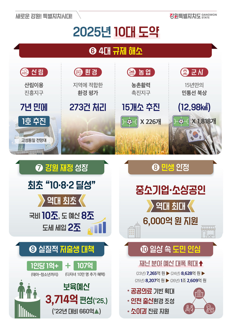 또한 산림·환경·농업·군사 등 4대 규제 해소로 도민 생활에도 실질적인 변화가 나타나고 있다. 군사 분야에서는 축구장 1,818개 규모의 민통선이 15년 만에 북상하는 성과를 거두는 등 규제 개선 효과가 가시화되고 있다.