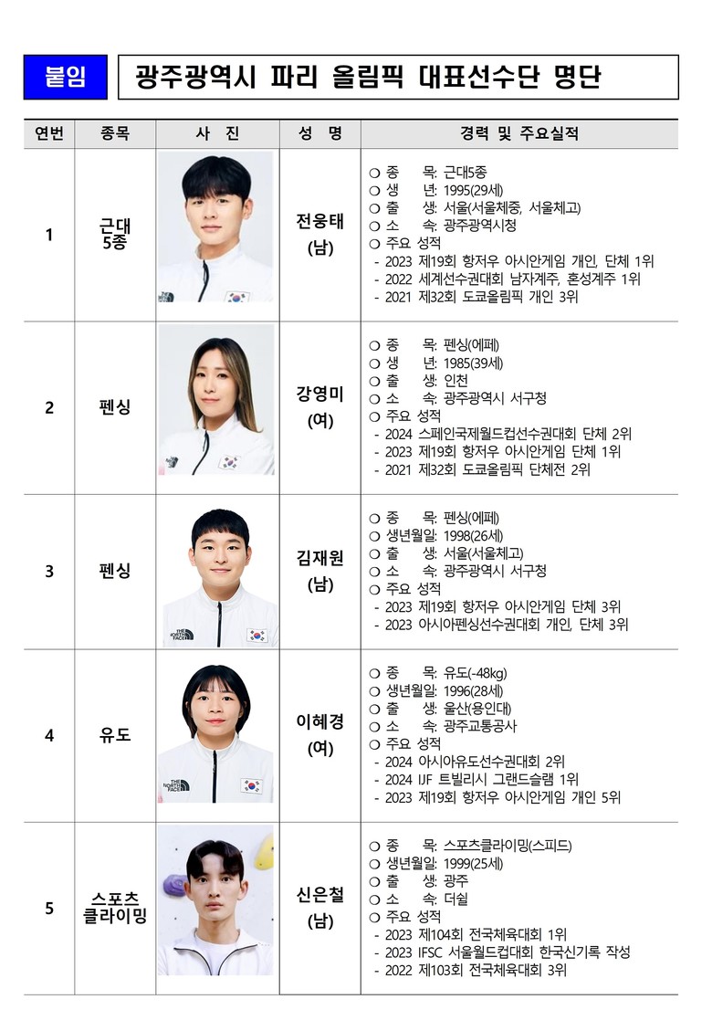 광주시 소속으로 출전하는 국가대표 선수단은 근대5종, 펜싱, 유도, 스포츠클라이밍 등 4개 종목 5명이다.