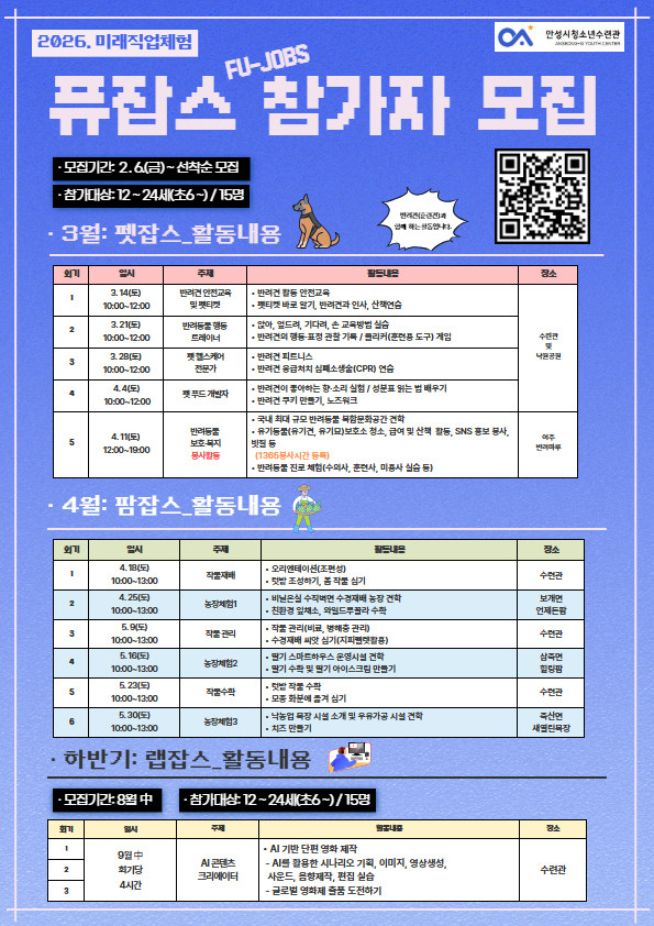 본 프로그램은 미래 직업에 관심 있는 청소년을 대상으로 하며, 참가 신청 및 세부 일정은 청소년수련관 홈페이지(https://www.asyc.or.kr) 또는 전화 문의(☎031-671-3124)를 통해 확인할 수 있다.