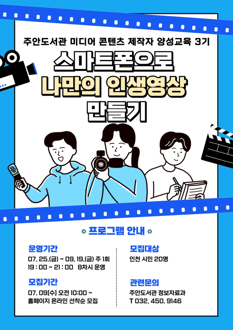 참가 신청은 7월 9일(수) 오전 10시부터 주안도서관 누리집(https://lib.ice.go.kr/juan/index.do)에서 선착순으로 가능하다.
