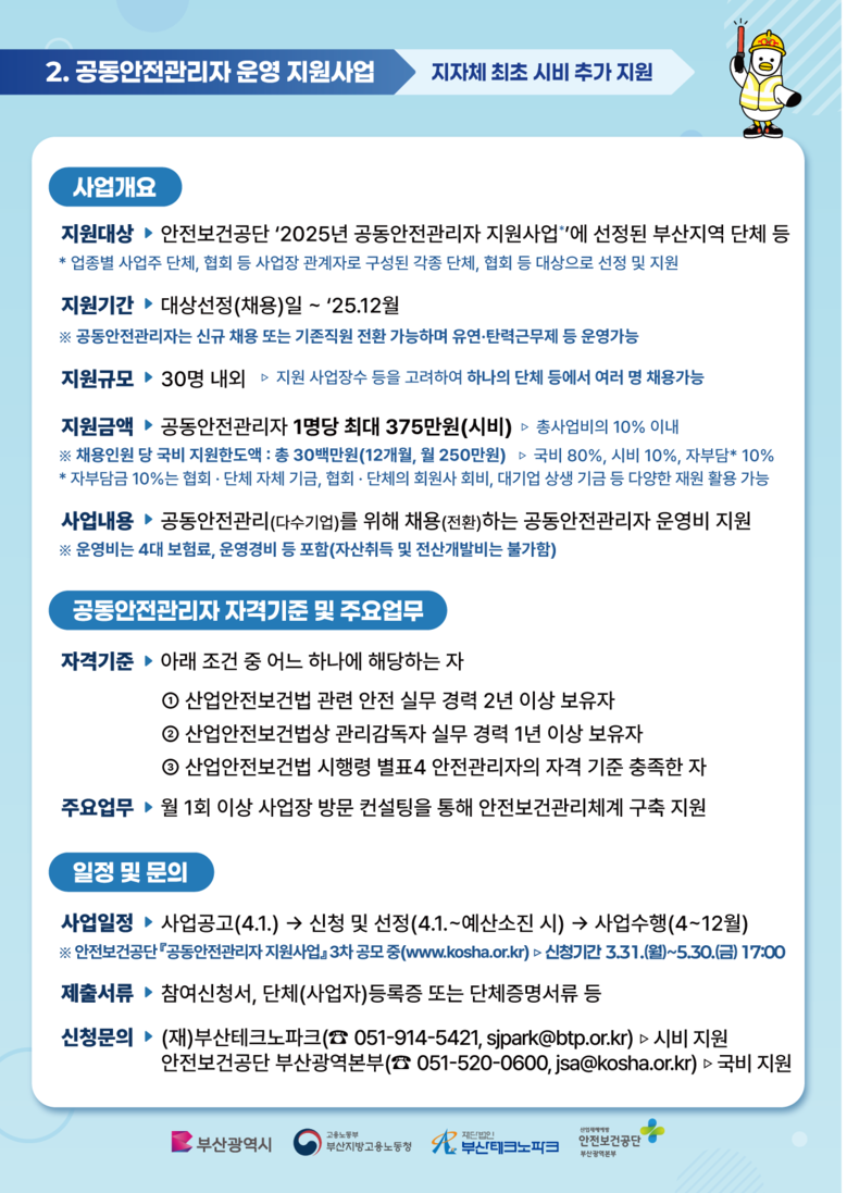 지원 대상은 안전보건공단 「2025년 공동안전관리자 지원사업」에 선정된 단체 등으로 제한되며, 이 사업 또한 오늘(1일)부터 신청서류를 부산테크노파크 전자우편(sjpark@btp.or.kr) 또는 방문을 통해 제출하면 된다. 단, 예산소진 시 접수는 마감된다.