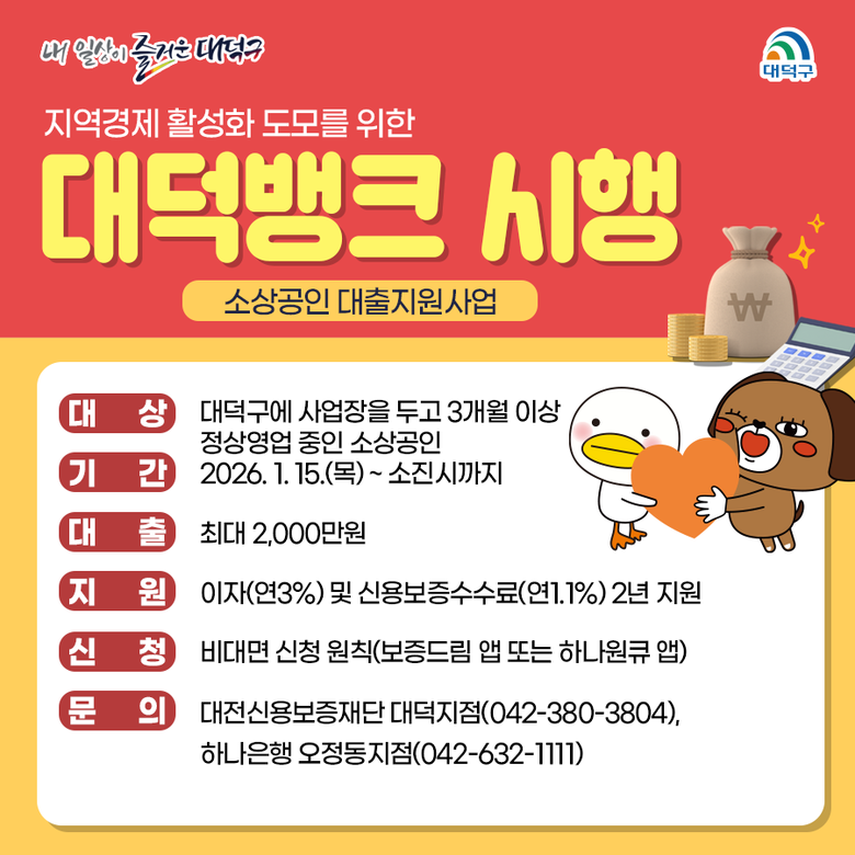 대덕구 관계자는 “이번 대덕뱅크 사업이 금융 부담으로 어려움을 겪는 지역 소상공인들에게 실질적인 도움이 되길 바란다”며 “앞으로도 지역경제에 활력을 불어넣을 수 있는 다양한 지원책을 지속적으로 마련하겠다”고 말했다.