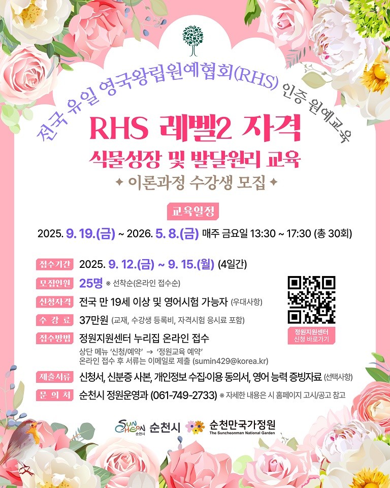 - 원격교육 병행으로 전국 수강생 접근성 확대 - [순천시 세계타임즈=우덕현 기자] 순천시(시장 노관규)는 정원원예와 식물학 분야에서 세계적으로 권위를 인정받는 영국왕립원예협회(이하 RHS)의 ‘RHS 레벨2 자격 식물성장 및 발달원리 교육(RHS Level 2 Certificate in the Principles of Plant Growth and Development)’ 이론 과정 수강생을 모집한다고 밝혔다.