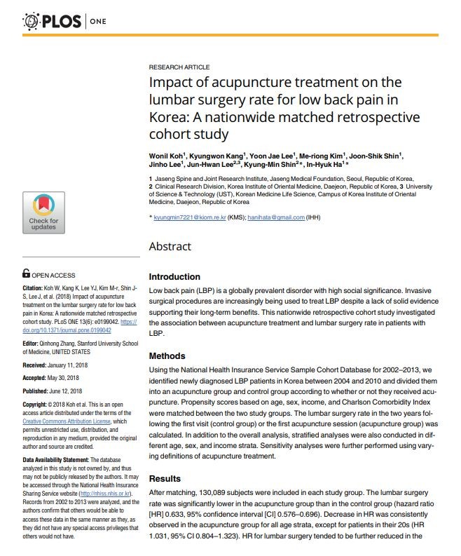 자생한방병원 척추관절연구소(소장 하인혁) 고원일 연구팀은 요통 환자들이 침치료를 받을 경우 요추수술률이 30%가량 감소하는 것으로 나타났다고 14일 밝혔다. 연구팀에 따르면 이 같은 결과는 30대 이상 전 연령층에서 동일하게 관찰됐으며 특히 침치료가 발병 직후에 이뤄질수록 더 낮은 요추수술률로 이어진다는 점을 확인할 수 있었다. 이번 연구성과는 SCI(E)급 국제학술지 플로스원(PLoS ONE, IF=2.806) 최신호(6월호)에 게재됐다.