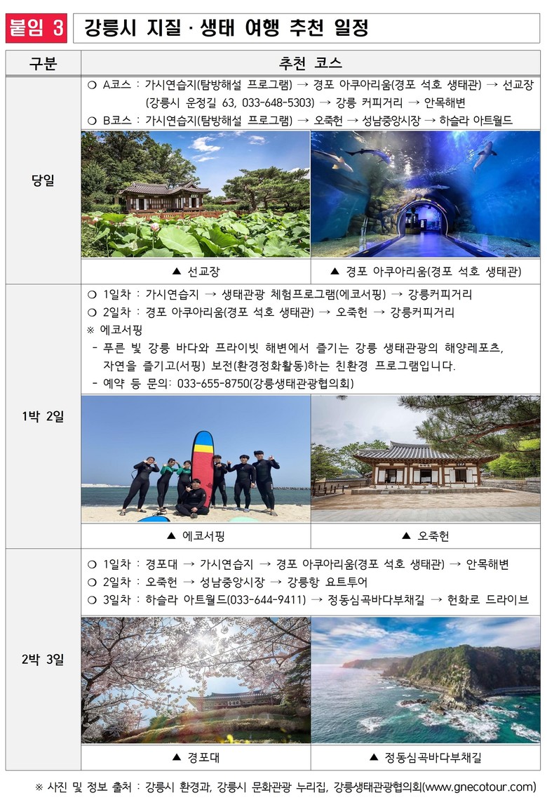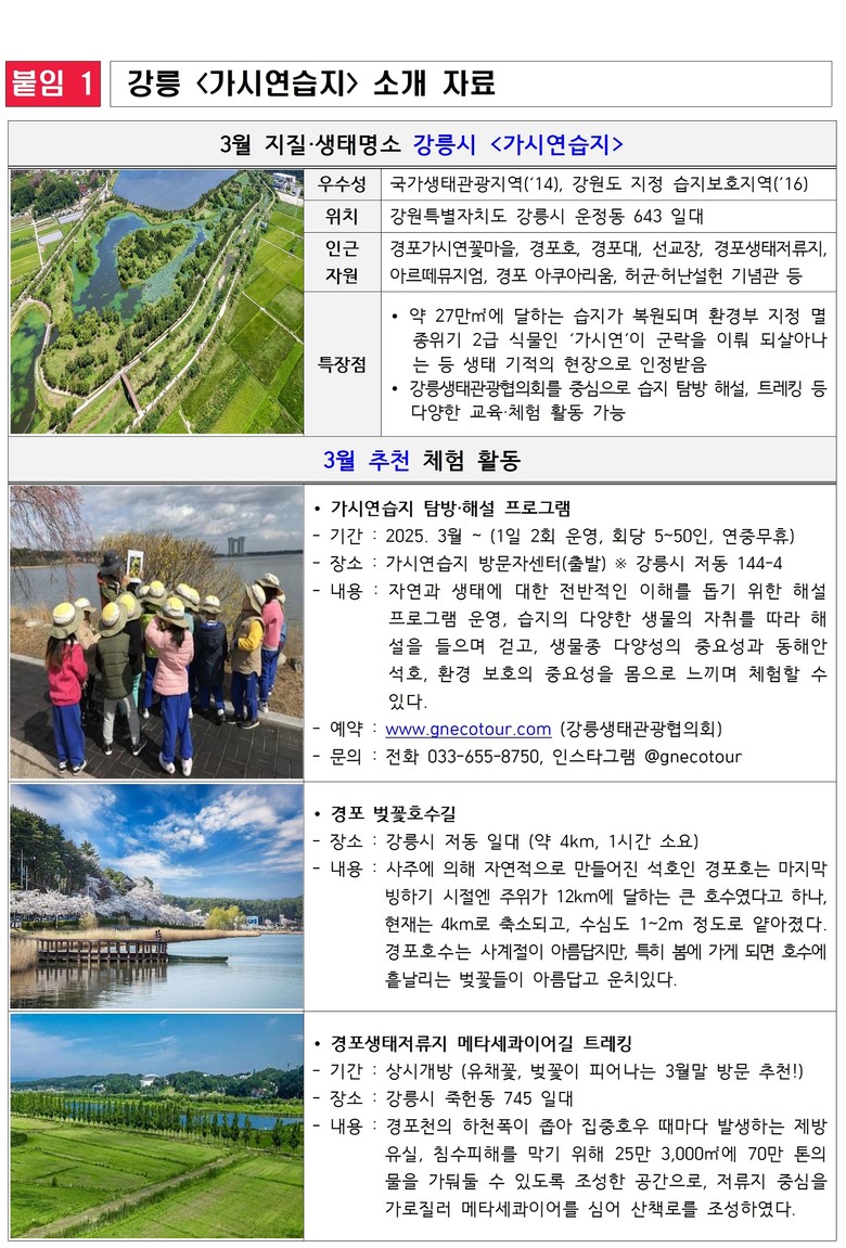 한편, 3월부터는 강릉생태관광협의회를 중심으로 습지 생태계에 대한 전반적인 이해를 돕기 위한 탐방 해설프로그램이 운영되며, 분기별 다양한 체험을 마련할 예정이다.
