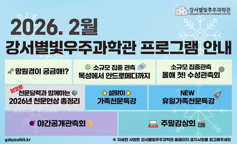프로그램은 1월 15일(목)부터 선착순 모집하며 조기 마감될 수 있다. 예약은 강서별빛우주과학관 누리집(https://gsbyeolbit.kr)에서 하면 된다.