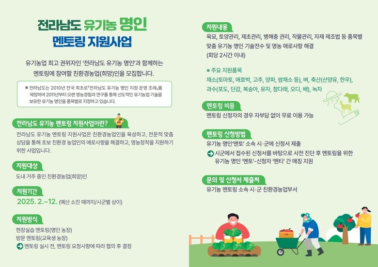 멘토링 희망(멘티) 대상자는 전남에 거주 중인 친환경 농업인이나 친환경 농업을 희망하는 도민이다. 멘토링 비용은 전액 무료다.