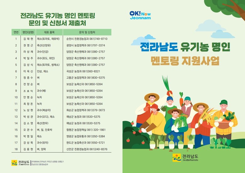 김영석 전남도 친환경농업과장은 “이번 사업은 친환경 농업을 시작하는 농업인이 역량을 키우는 좋은 기회가 될 것”이라며 “경험 많은 명인의 현장 지도를 통해 유기농 기술을 습득하고 안정적으로 정착하도록 적극 지원하겠다”고 말했다.
