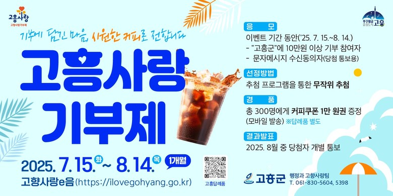 이번 이벤트는 오는 7월 15일부터 8월 14일까지 한 달간 진행되며, 고흥군에 10만 원 이상 기부하고 문자 수신에 동의한 기부자는 별도 신청 없이 자동 응모된다. 군은 이벤트 종료 후 무작위 추첨을 통해 총 300명을 선정, 1만 원 상당의 모바일 커피 쿠폰을 제공할 예정이다. 당첨자는 8월 중 개별 통보되며, 쿠폰은 모바일로 일괄 발송된다.