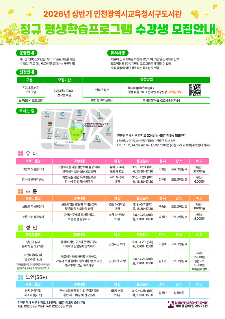 수강료는 무료이나 교재·재료비는 개인이 부담해야 하며, 자세한 사항은 서구도서관 독서문화과(☎ 032-585-7184)로 문의하면 된다.
