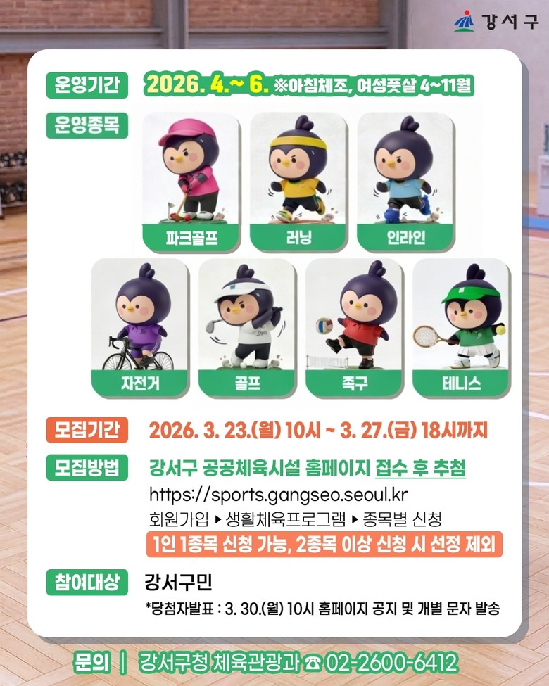 신청은 오는 3월 23일(월) 오전 10시부터 3월 27일(금) 오후 6시까지 강서구 공공체육시설 누리집을 통해 온라인으로 할 수 있다.