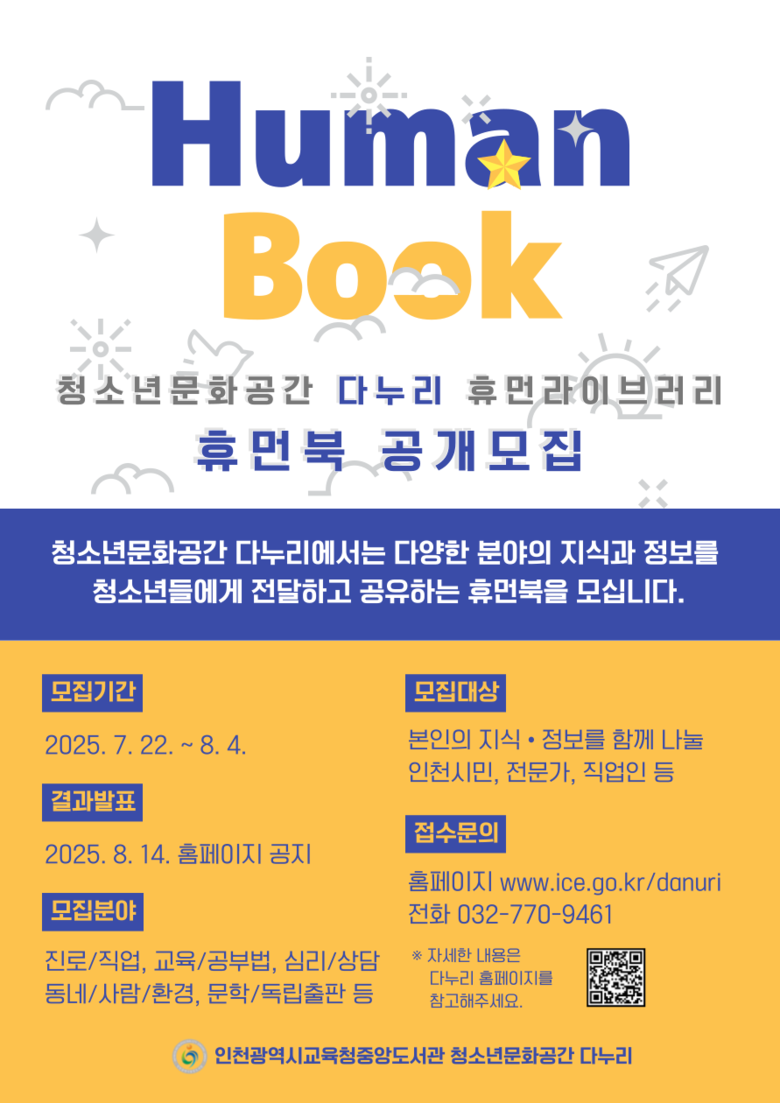 휴먼북은 청소년과 지역사회에 지식·기술·경험을 나누고자 하는 시민 누구나 지원 가능하며, 심사를 거쳐 8월부터 활동하게 된다.