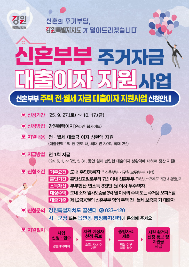 김순하 강원특별자치도 건축과장은 “도내 신혼부부들이 보다 많은 혜택을 받을 수 있도록 각별한 관심을 부탁드린다”며, “앞으로도 신혼부부 가구의 도내 정착을 돕기 위해 맞춤형 지원 서비스를 지속적으로 발굴·추진하겠다”고 말했다.