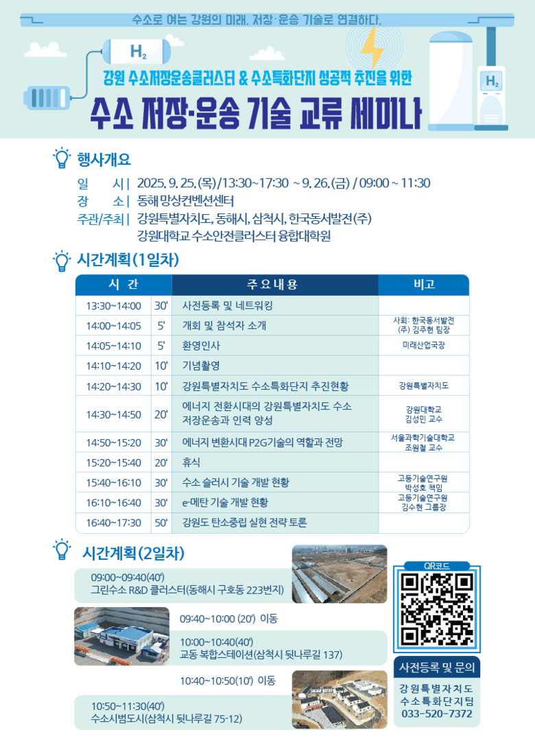 이번 세미나는 에너지 전환과 탄소중립 실현을 위해 수소 저장·운송 분야의 혁신 기술을 공유하고, 기업·대학·연구기관 간 협력 기반을 강화하기 위해 마련됐다. 강원특별자치도와 동해시, 삼척시, 한국동서발전㈜, 강원대학교 수소안전클러스터 융합대학원이 공동으로 주관·주최하며, 고등기술연구원, 서울과학기술대학교 등 수소 산업 관계자들이 대거 참여한다.