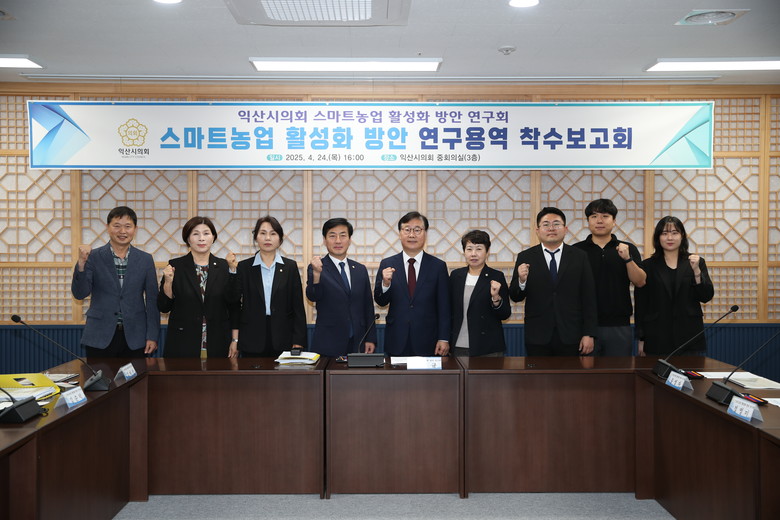 익산시의회 의원연구단체 「스마트농업 활성화 방안 연구회(대표의원 김진규)」는 4. 24.(목) 연구단체 회원들과 관계 공무원, 용역사 등이 참석한 가운데 「익산시의회 스마트농업 활성화 방안 연구용역」 착수보고회를 개최했다.