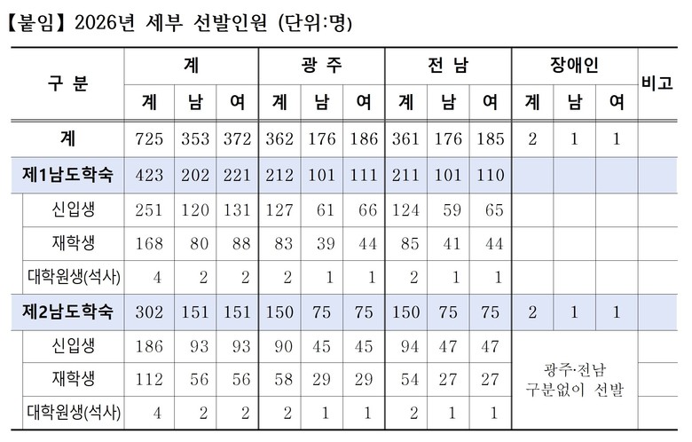 올해 선발 인원은 광주 362명, 전남 361명, 장애인 2명이다. 제1남도학숙(동작관)에 423명, 제2남도학숙(은평관)에 302명이 입사하며 신입생 437명, 재학생 280명(장애학생 포함), 대학원생 8명이다.