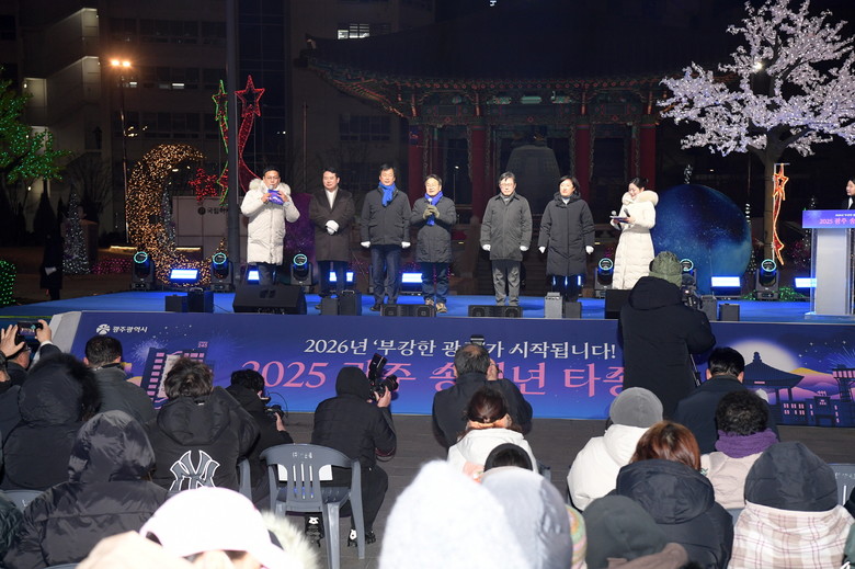 [광주 세계타임즈=손권일 기자] 강기정 광주광역시장이 1월1일 민주의 종각에서 열린 송·신년 시민행사 타종식에서 2025년 한 해 광주를 빛낸 시민대표와 함께 타종을 하고 있다. / 광주광역시 제공