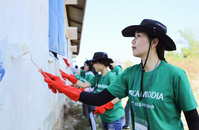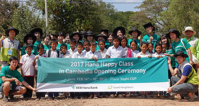 KEB하나은행의 'Hana Happy Class 캄보디아' 봉사활동은 하나금융그룹의 사회공헌 축제인 ‘2016 모두하나데이’ 캠페인의 일환으로, 하나멤버스 나눔 이벤트 참여를 통해 선정된 20명의 손님과 국제 구호단체인 굿네이버스도 함께 하여 그 의미를 더했다.