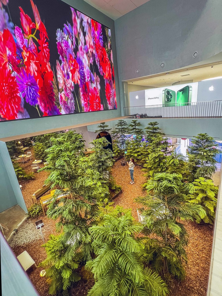 T팩토리 1.5층에 위치한 ‘팩토리 가든’은 살아있는 식물과 울창한 나무로 꾸민 자연 정원으로, 자연과 디지털의 조화 속에서 숲속 힐링을 경험할 수 있는 공간이다.