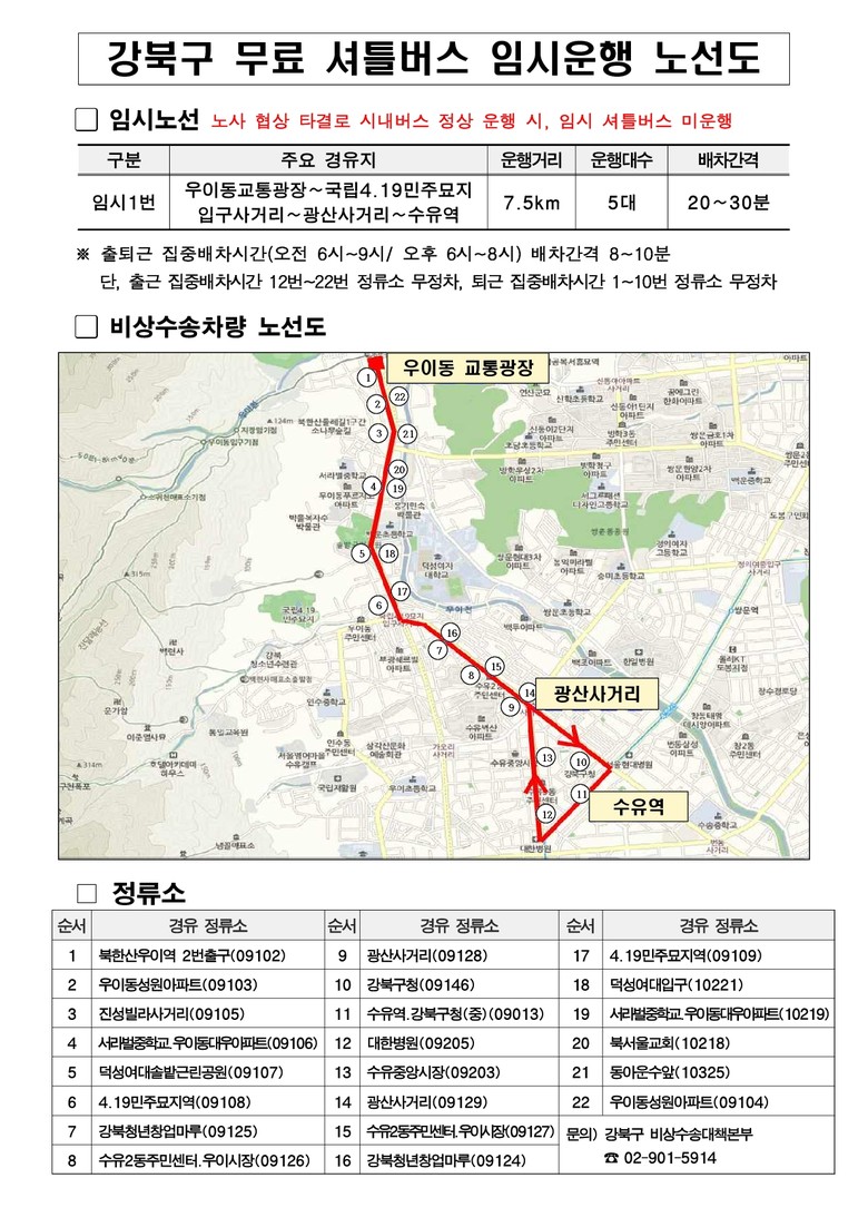 비상수송대책의 핵심으로, 구는 ‘임시 무료 셔틀버스(임시 1번)’를 운영하고 있다. 셔틀버스는 우이동 교통광장에서 수유역까지 약 7.5km 구간을 운행하며, 전세버스 10대가 투입돼 오전 6시부터 밤 10시까지 운행된다.