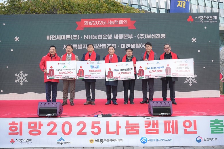 법인은 ▲비전세미콘㈜ 3,131만 원 ▲㈜보쉬전장 1,000만 원 ▲세종특별자치시산림조합 1,000만 원 ▲NH농협은행 세종본부 1,000만 원 ▲미래생활 주식회사가 4,000만 원 상당의 희망나눔 물품을 기탁했다.
