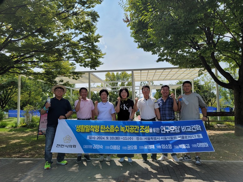 [천안시 세계타임즈=백택기 기자] 천안시의회 「생활밀착형 탄소흡수 녹지공간 조성」의원 연구모임(김명숙(대표의원), 이종담, 권오중, 유영채, 엄소영, 박종갑, 이병하)에서는 9월 10일(화)~9월 11일(수) 1박 2일간의 일정으로 생활밀착형 녹지공간 조성 우수사례 비교견학을 위해 서울특별시를 방문했다.