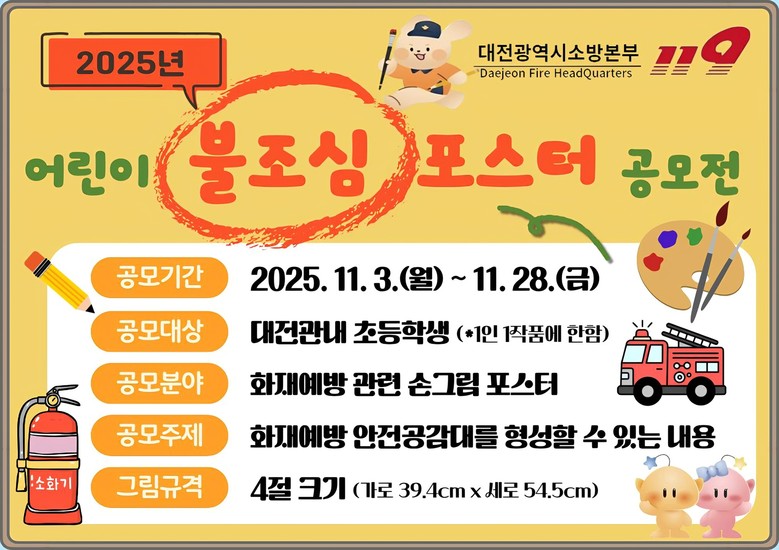 안정미 대전소방본부 예방안전과장은 “이번 공모전이 어린이들이 화재 예방의 중요성과 불조심의 의미를 다시 한 번 생각해보는 계기가 되길 바란다”며, “많은 어린이들의 관심과 참여를 기대한다”라고 말했다.
