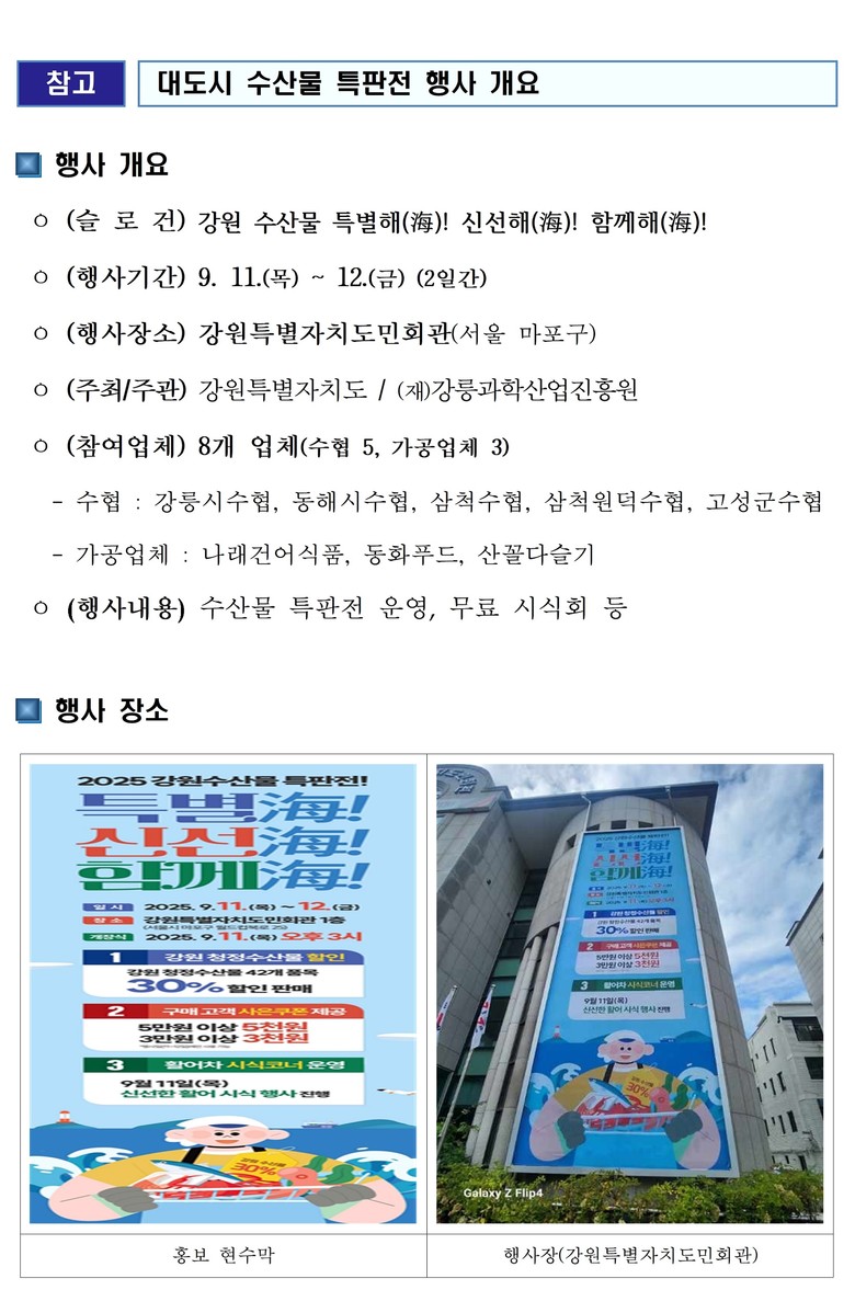 행사장에서는 시민들이 합리적인 가격으로 다양한 수산물을 구매할 수 있도록 전 품목 30% 할인을 실시하며, 3만 원 이상 구매 시 3천 원, 5만 원 이상 구매 시 5천 원의 할인 쿠폰을 추가로 제공한다. 또한 도민회관 내 강원푸드마켓과 연계해 타임세일 등을 진행, 현장 분위기를 더욱 풍성하게 할 계획이다.