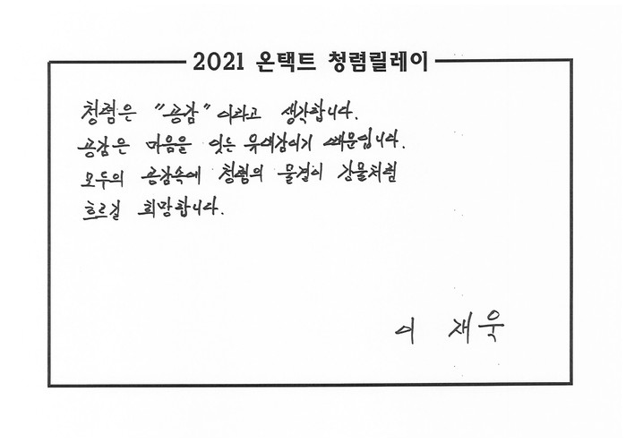 ‘청렴 릴레이는’ 임직원 전체가 참여하는 교육 등이 시행되기 힘든 코로나19 사회적거리두기 상황에서도 청렴에 관해 지속적으로 그 중요성을 일깨우고자 하는 취지에서 진행되는 것이다.