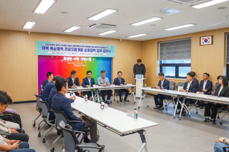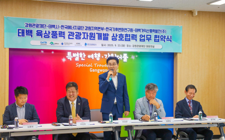 [강원도 세계타임즈=김민석 기자] 강원관광재단(대표이사 최성현, 이하 재단)은 지난 9월 23일(화) 태백시, 한국에너지공단 강원지역본부, 한국기후변화연구원, 태백가덕산풍력발전㈜과 함께 ‘육상풍력 관광자원 개발을 위한 상호 협력 협약’을 체결하고 폐광지역 관광의 새로운 미래를 열겠다고 밝혔다.