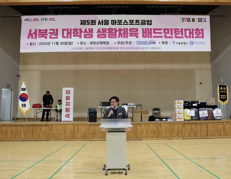 [마포구 세계타임즈=이장성 기자] 박강수 마포구청장은 11월 30일 오전 10시, 성미산체육관에서 열린 ‘2025 서북권 대학생 배드민턴 대회’에 참석해 참가자들을 격려했다.