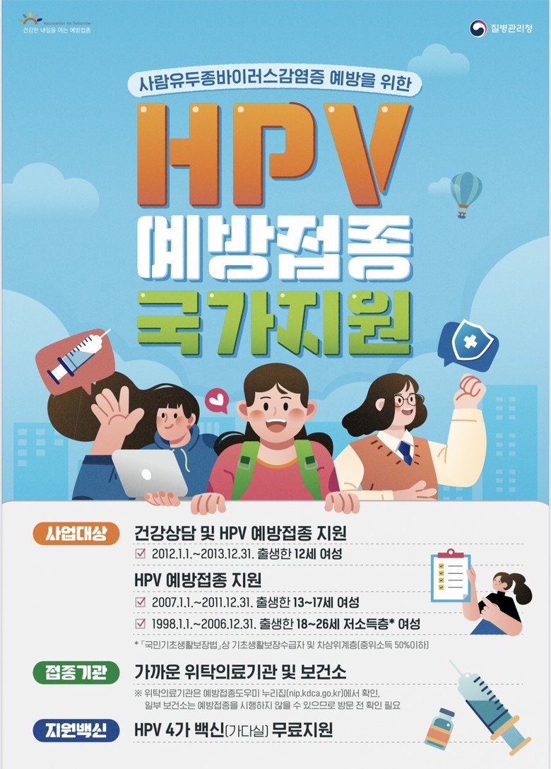 무료 예방접종 지원 대상은 주민등록상 출생 연도를 기준으로 12~17세 여성 청소년(2007.1.1.~2013.12.31. 출생자) 및 18~26세(1998.1.1.~2006.12.31. 출생자) 저소득층 여성이다. 저소득층의 경우, 접종 당일 기준 기초생활수급자 또는 차상위계층(중위소득 50% 이하)에 해당해야 한다.