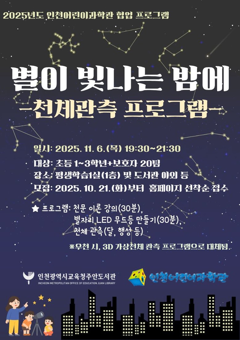 이번 프로그램은 지난해 체결된 인천어린이과학관과의 업무협약에 따라 진행되는 협업 사업으로, 11월 6일(목) 오후 7시 30분부터 9시 30분까지 주안도서관 평생학습 1실과 야외에서 진행된다.