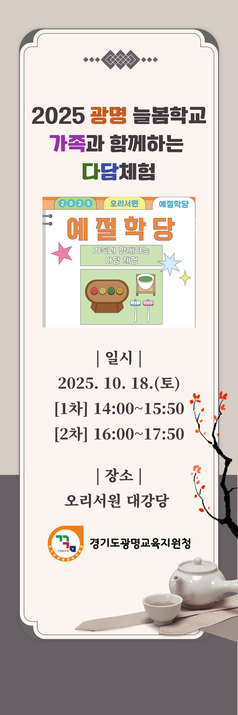 ◦광명교육지원청 늘봄지원센터, 차와 이야기로 부모와 함께 소통하며 예절교육을 배우는 ‘가족과 함께하는 다담체험’ 개최