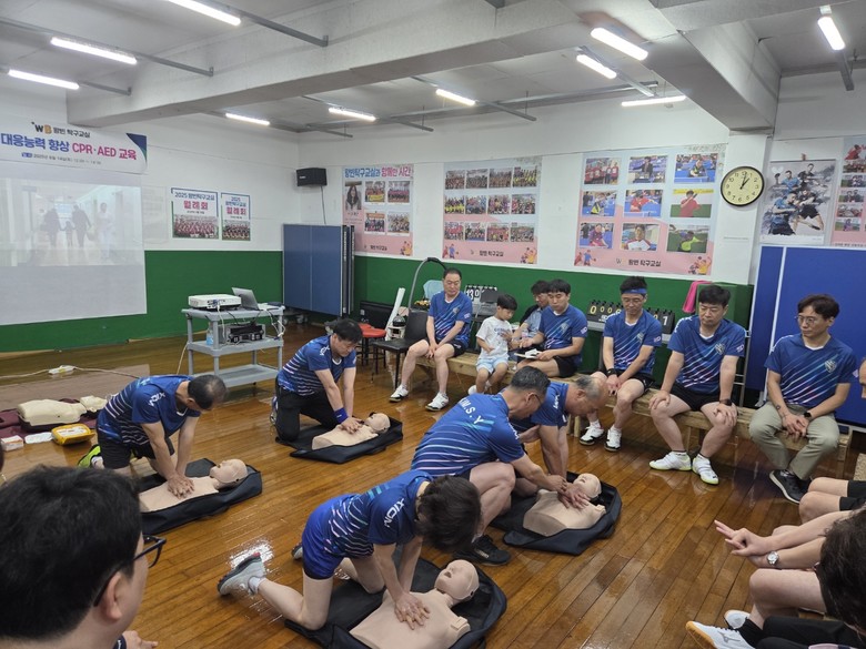 이번 교육은 응급상황 현장 대처 방법, 심폐소생술, 자동 제세동기(자동심장충격기:AED) 사용법 등에 대해 이론 및 실습 교육으로 약 2시간에 걸쳐 진행 되었다.