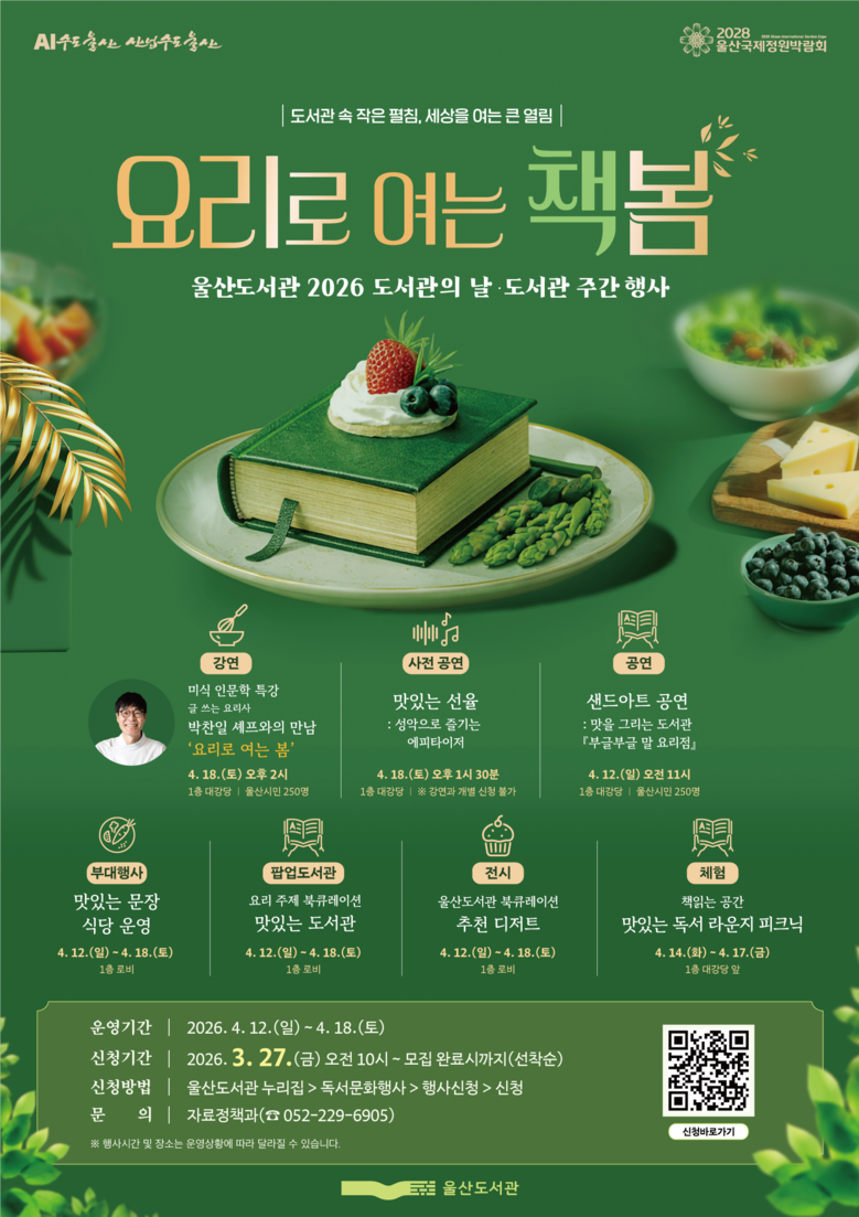 울산도서관 관계자는 “도서관의 날과 도서관 주간을 기념해 시민들이 도서관을 통해 새로운 문화를 즐기면서 건강한 맛도 챙기는 다양한 프로그램을 준비했다”라며, “울산도서관에서는 요리를 주제로 한 인문학적 즐거움을, 울산어린이청소년도서관에서는 반려동물을 통해 생명 존중과 공감의 가치를 배우며 스스로 성장하는 계기가 되길 바란다”라고 말했다.