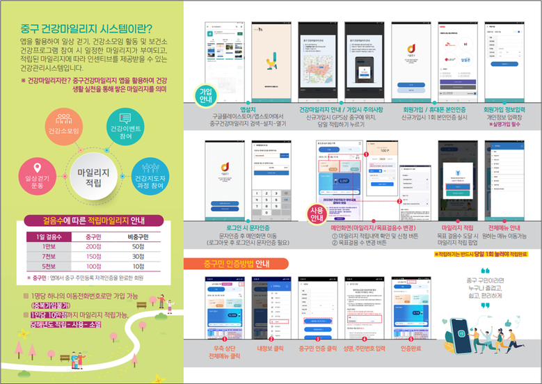 한편 중구건강마일리지 앱을 설치하고 걸으면, 걸음 수에 따라 중구민은 하루 최대 200점, 타지역 거주민은 50점까지 적립 가능하다. 연간 최대 10만 점까지 쌓을 수 있으며 자세한 사항은 보건지소과(☎02-3396-6395)로 문의하면 된다.