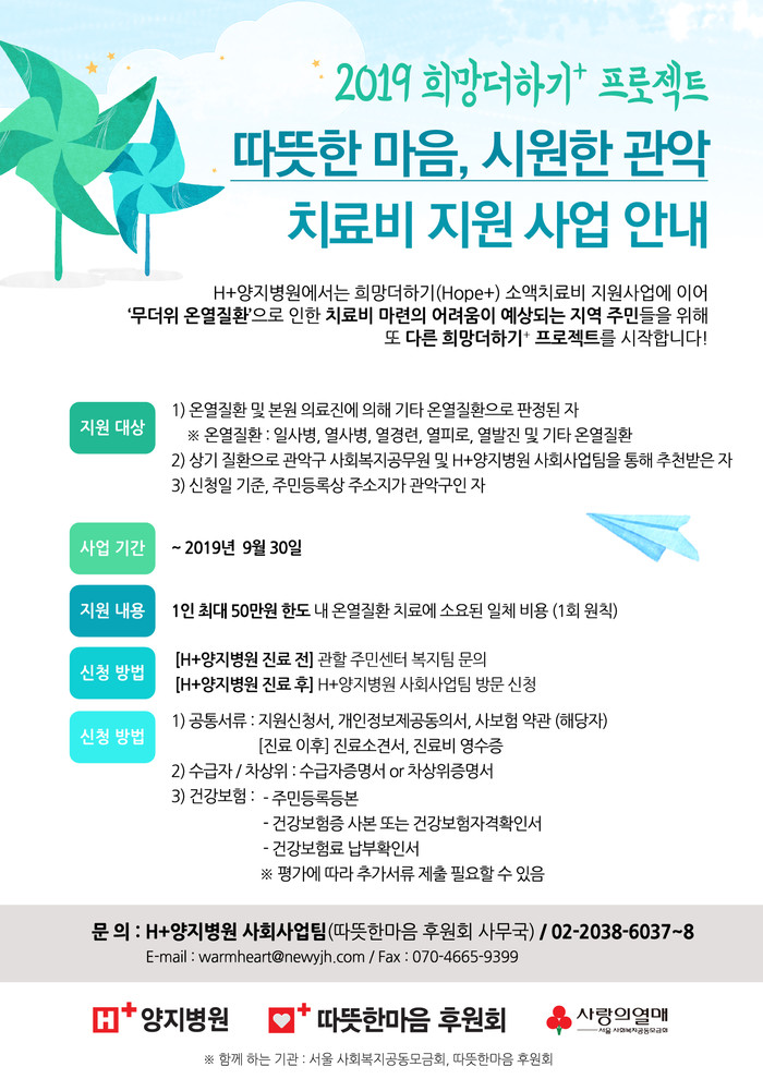 서울 서남부권 관악구 소재 종합병원 에이치플러스(H+) 양지병원(병원장 김상일)은 지난 7월 1일부터 무더위로 인한 온열질환으로 치료가 필요하지만 비용 마련에 어려움을 겪는 관악구 주민들을 위해 치료비 지원사업 ‘따뜻한 마음, 시원한 관악’ 프로젝트를 펼친다.