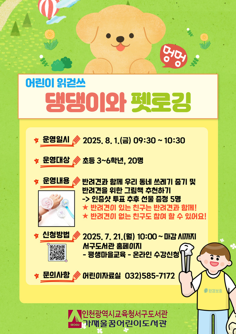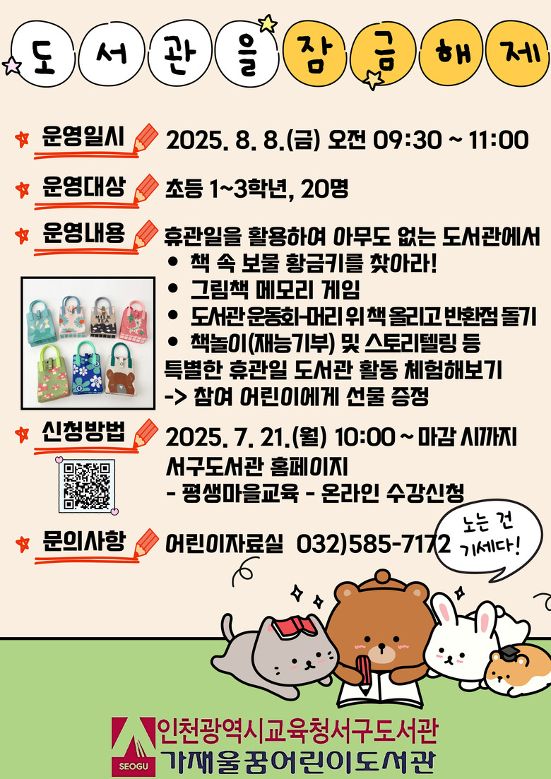 자세한 내용은 서구도서관 누리집(https://lib.ice.go.kr/seogu) 또는 어린이자료실(☎032-585-7172)로 문의하면 된다.