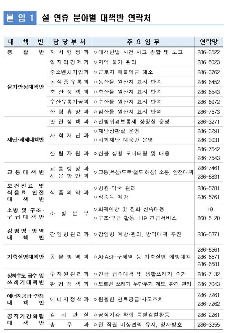 이를 위해 자치행정과에 종합상황실을 설치하고 분야별 대책반 상황실을 함께 운영해 연휴 기간 행정 공백을 최소화한다. 총 11개 대책반에 하루 평균 48명(도 29·소방본부 19), 연인원 239명이 근무한다. 대책반은 해당 부서장 책임하에 24시간 비상근무체계를 유지한다.