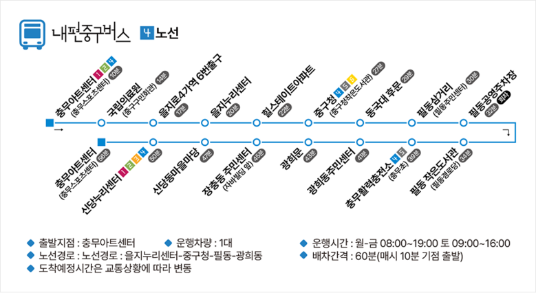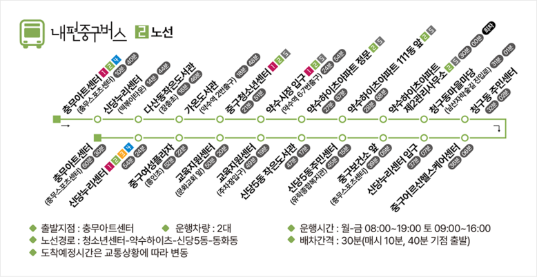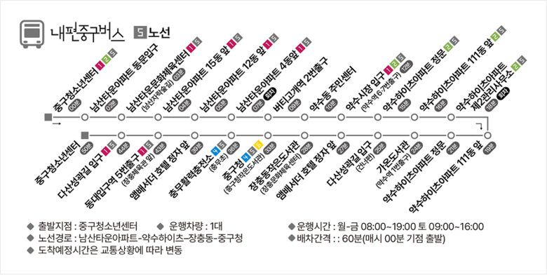 주요 거점에서는 노선 간 환승도 가능하다. △충무아트센터 △신당누리센터 △가온도서관 △중구청소년센터 △중구청 △소공동주민센터 △회현역 6번 출구 △서울역 서부 등 8곳에서 편리하게 갈아탈 수 있다.