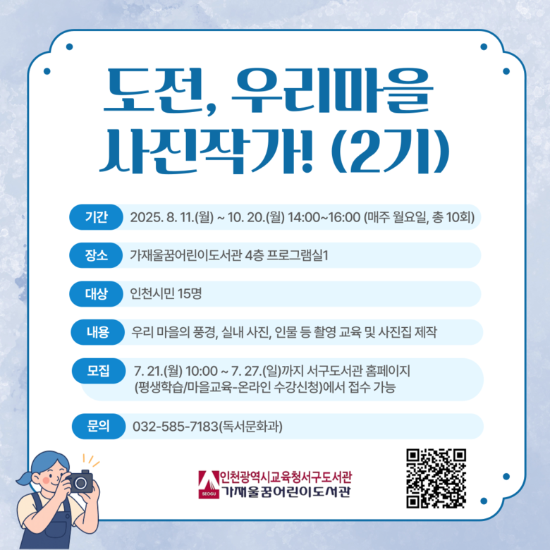 자세한 사항은 서구도서관 누리집(http://lib.ice.go.kr/seogu) 또는 독서문화과(☎032-585-7183)에서 확인할 수 있다.