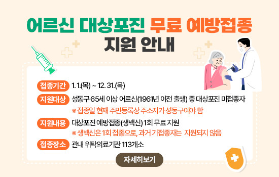 [성동구 세계타임즈=이장성 기자] 서울 성동구(구청장 정원오)는 2026년 1월 1일부터 65세 이상 어르신을 대상으로 대상포진 무료 예방접종을 실시한다고 밝혔다. 접종 대상은 1961년 12월 31일 이전 출생자로, 성동구에 주민등록을 둔 구민이다.