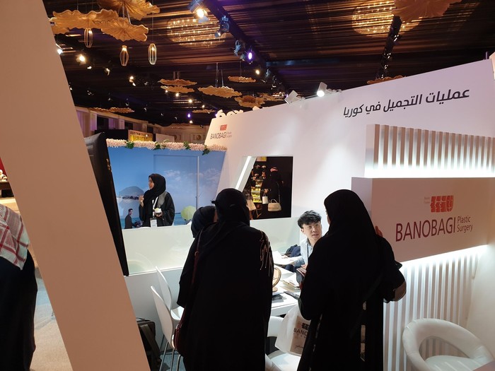 | ▲지난 13일 사우디아라비아 수도인 리야드 나야라 홀(Nayyara Hall)에서 열린 ‘2019 리야드 웨딩박람회’에서 바노바기 성형외과 직원이 부스에 찾아온 관람객을 응대하고 있다. (사진=바노바기 성형외과 제공) |