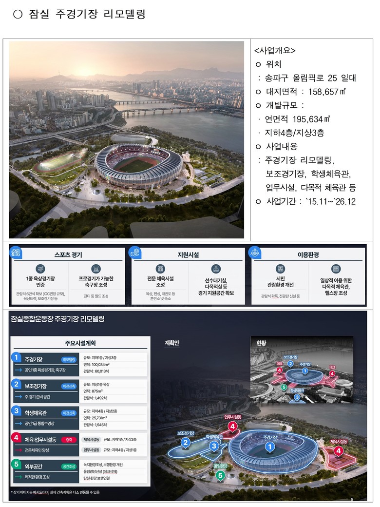 주경기장 리모델링은 올림픽 주경기장 관람환경 개선과 더불어 육상, 펜싱, 태권도 등 전문체육인 양성을 위한 훈련소 및 숙소, 시민들을 위한 생활체육시설을 확충하는 사업이다.