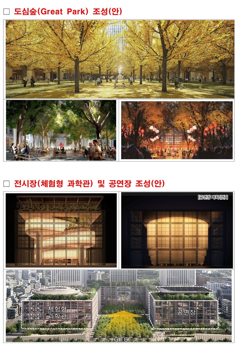 49층 타워 3개동에는 오피스와 호텔을 비롯해 시민들이 자유롭게 즐길 수 있는 전시장 등 복합문화공간을 운영하고, 타워동 최상층부에는 한강과 도심이 내려다보이는 전망 공간을 설치한다. 타워 사이에는 서울광장 2배 규모 녹지도 조성해 서울을 대표하는 ‘글로벌 비즈니스‧문화 중심지’로 새롭게 탄생시킨다는 계획이다.