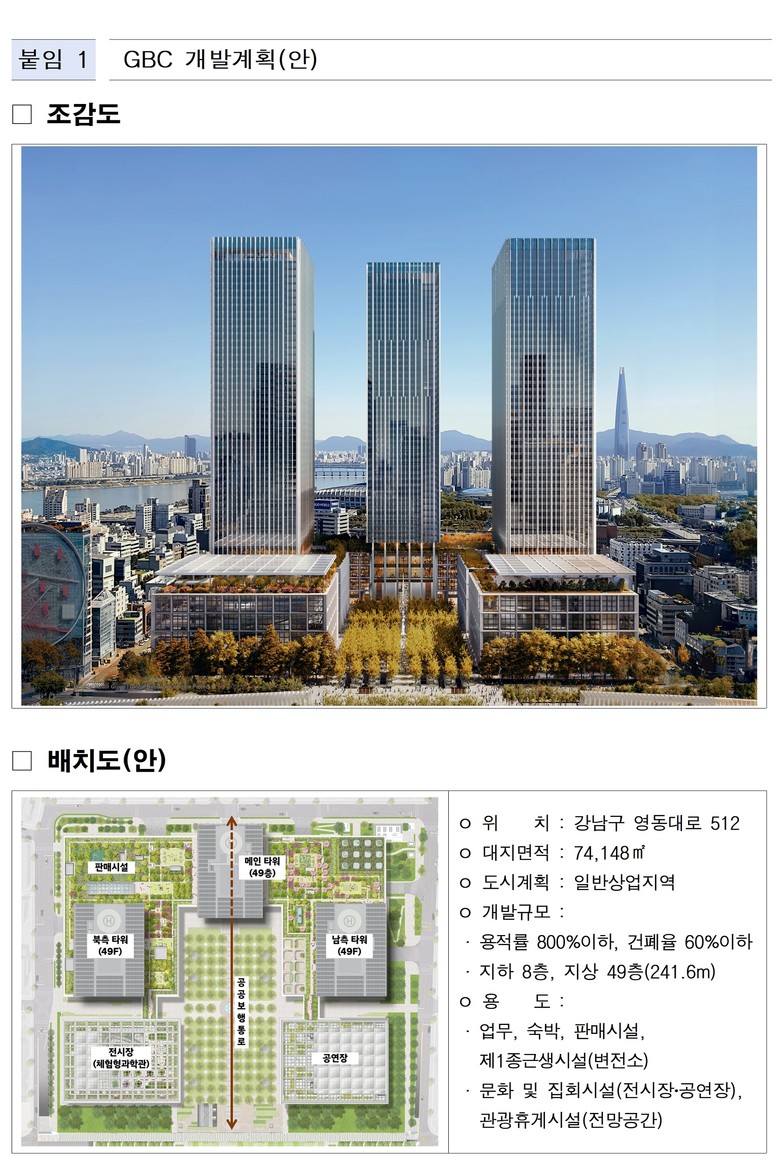 김창규 서울시 균형발전본부장은 “이번 추가협상으로 국제교류복합지구 핵심 부지에 대규모 개방형 도심숲, 전시·문화시설, 옥상정원 등 시민 여가 공간을 대폭 확충한 새로운 랜드마크 건립을 계획했다”면서 “장기간 표류한 GBC 개발을 신속 추진해 도시의 새로운 성장동력이자 서울을 대표할 수 있는 상징적인 공간으로 완성할 것”이라고 밝혔다.