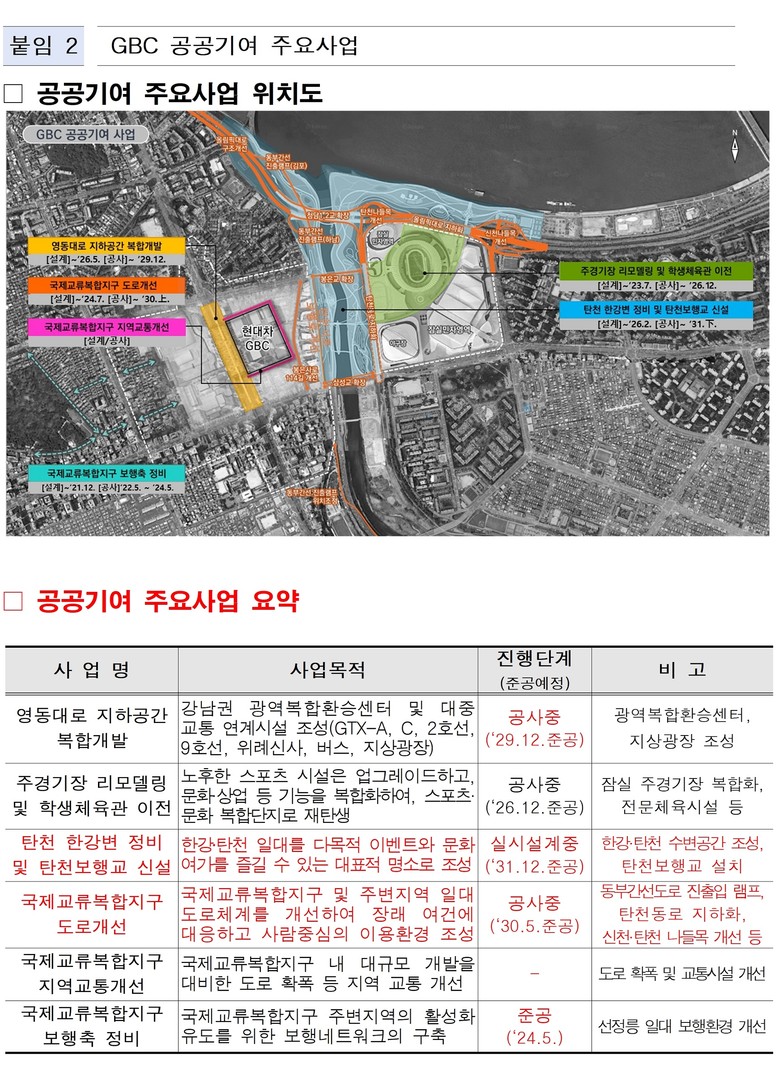 현재 GBC 공공기여금은 영동대로 지하공간 복합개발, 잠실주경기장 리모델링 등 국제교류복합지구의 핵심 인프라 구축과 지역 일대 교통체증 개선을 위한 도로사업, 한강‧탄천 수변공간 조성 등에 활발히 사용 중이다.