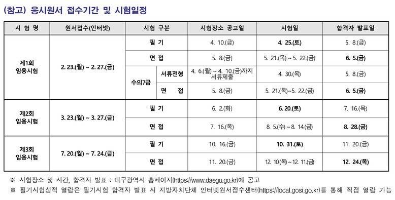 시험 일정 및 선발예정인원, 달라지는 시험제도 등 시험 관련 확정된 내용들은 대구광역시 홈페이지(www.daegu.go.kr) ‘시험정보란’을 통해 확인할 수 있다.